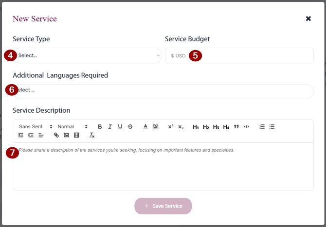 (e.g. if the vendor needs to communicate with the guests in a different language) - Add a description for the service. Be as precise as possible giving away your or your clients personal information or violating any NDA you have in place.