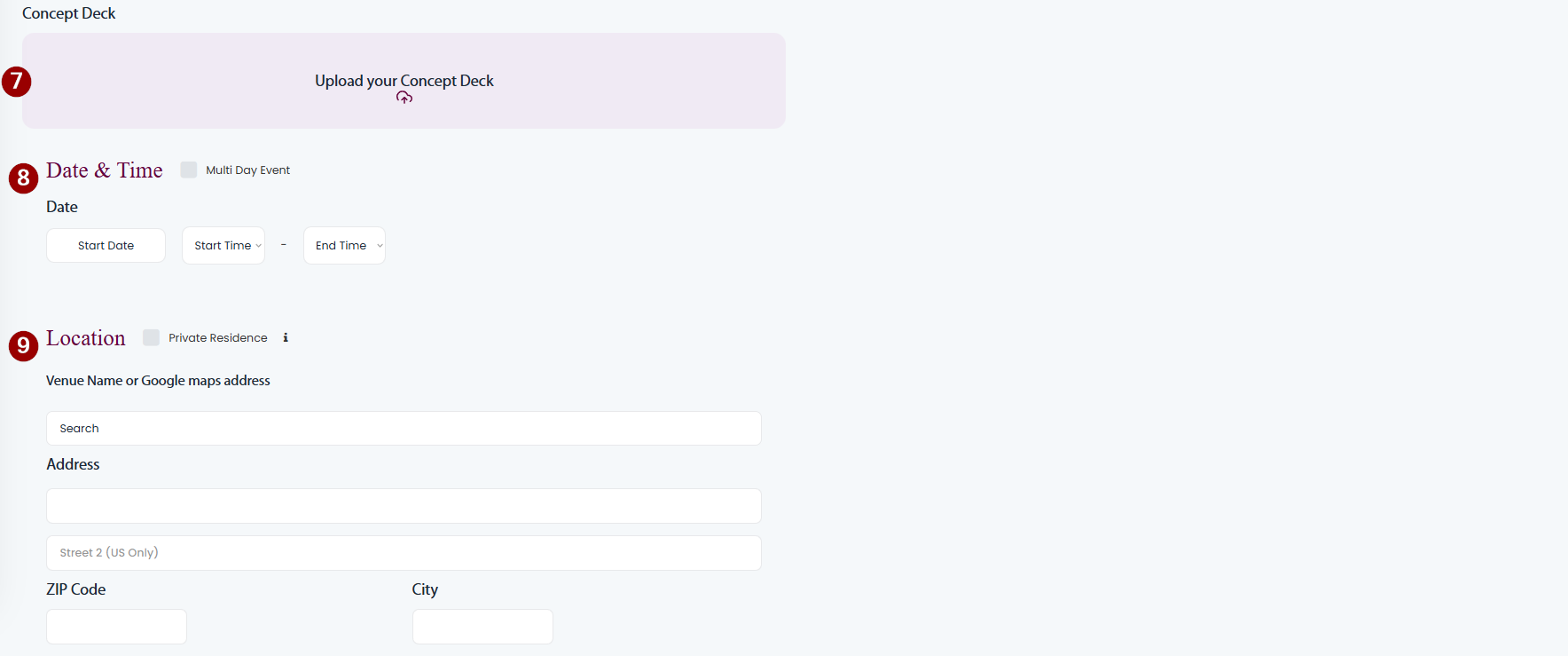 ** If you have an NDA that prevents you from disclosing the Venue, check the Private Residence checkbox.