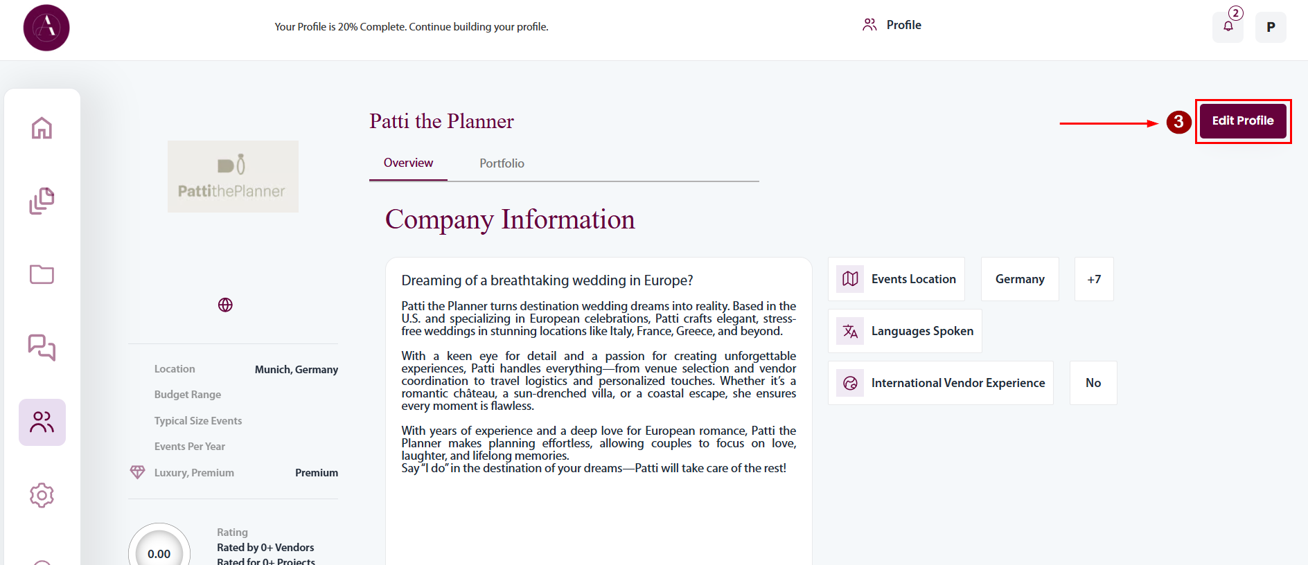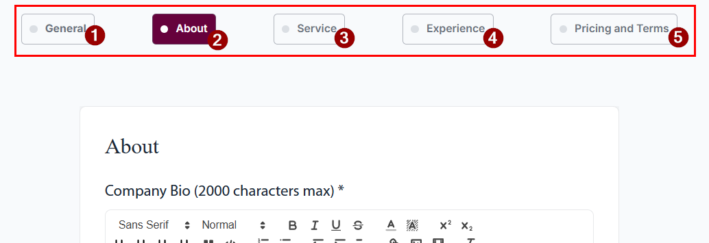 - Details about your Business (Company Bio, Logo, Languages, Operational Capacity, Communication Preferences, Your Business Values and Attributes)