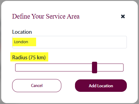Option A: Start typing the central point (city) and set the radius of your service area.